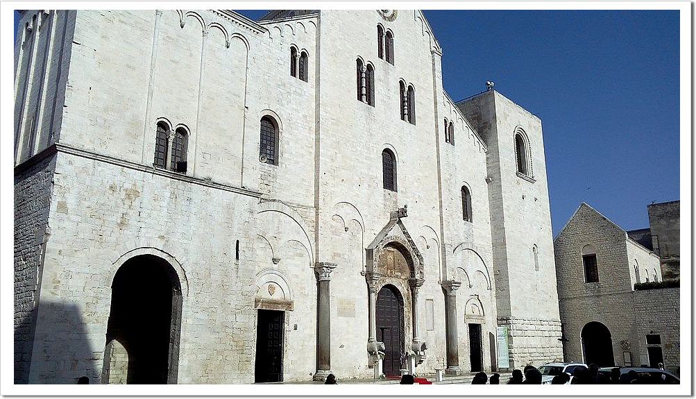 La Basilica era l'antico palazzo amministrativo del Catapano, l’autorità bizantina in città. La basilica, monumento simbolo di Bari, forse una delle chiese più belle al mondo, si fondono elementi dell’architettura romanica e delle sue molteplici influenze, bizantine, arabe, longobarde, normanne. Nella cripta sono custodite le reliquie di San Nicola, Vescovo di Myra, il Santo più venerato della Cristianità. |